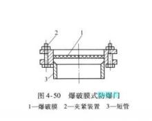 爆破膜式防爆門是由爆破膜和夾緊裝置組成的,如圖2所示。當爆炸在燃燒室內發生時,所產生的壓力使爆破膜破壞,起到泄壓作用。爆破材料有石棉和鋁、銅等有色金屬,根據壓力、溫度等選用。目前用得較多是石棉水泥板。爆破膜式防爆門常裝置在煙道上。